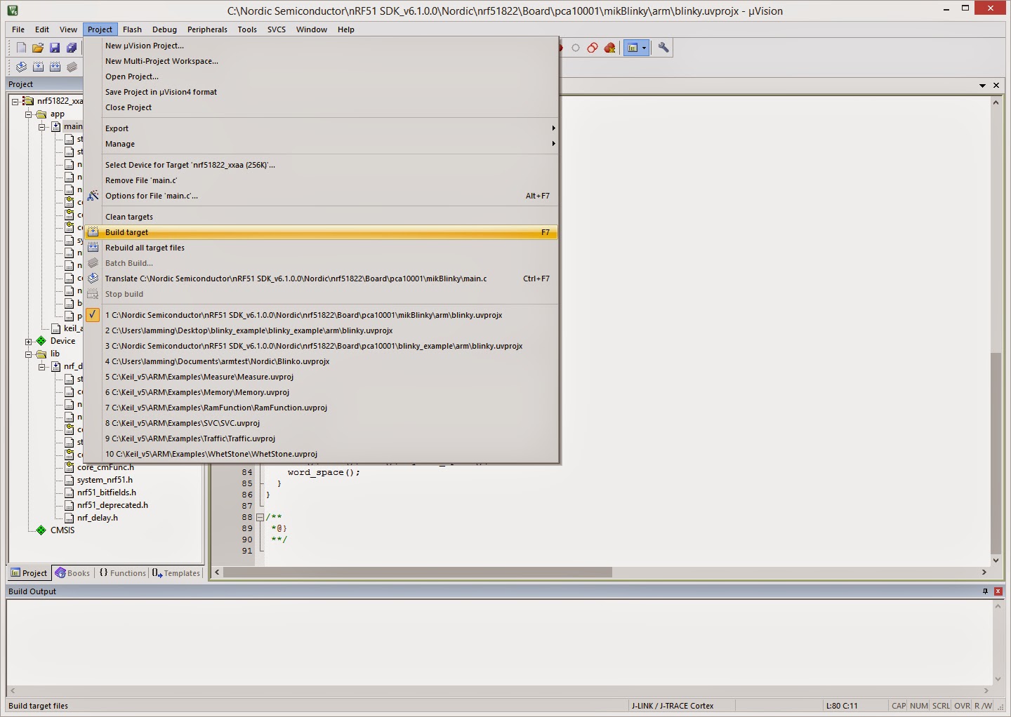 Hello World in embedded space is something that just blinks a LED. My version is called MikBlinky. To compile and run this code on a Nordic PCA10001 eval board you need to do the following: