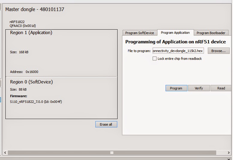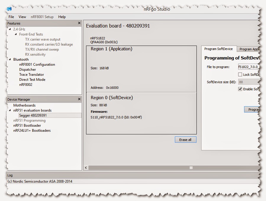 To program the softdevice into the 51822 you have to first install their special program called nRFgo Studio. So… yet another download, and installation.