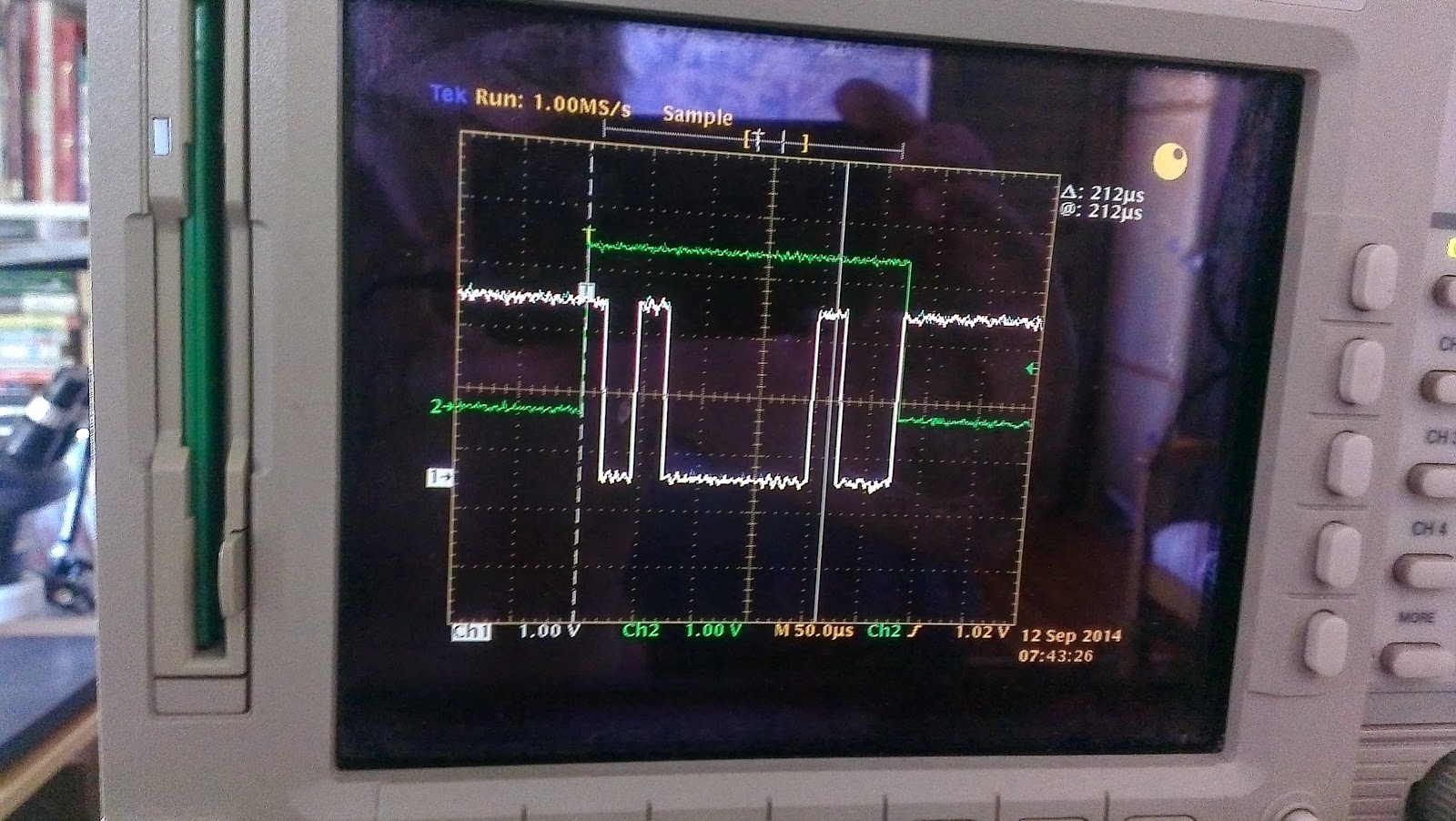 The scope showed the bits coming out like this. i.e. a byte value of 0x01 actually appears on the scope like this.