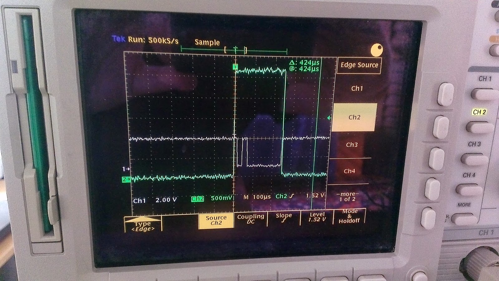 Now I dragged out the ‘scope. Used one of the LED pins as a trigger. I made a program that outputs all characters from 0..127 at 100ms intervals.