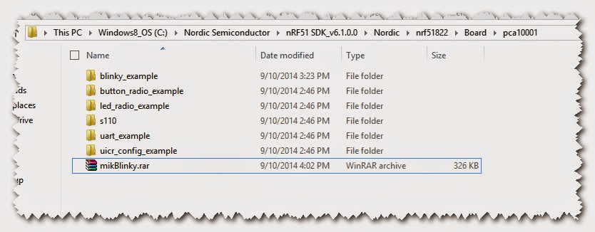 Unpack it to this place.** If you don’t have this place already set up then you probably didn’t manage to install the Nordic SDK nrf51_sdk_v6_1_0_b2ec2e6.msi and you should have another look at this blurb. You need to have all the Nordic libraries and stuff set up in the right place or the compile won’t find them.