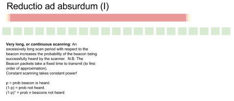 So what’s the goldilocks size? After all this analysis, my answer is still “dunno”. To be sure that the listen period is long enough, it clearly has to be at least as long as the advertisement. But if it is the same length there is actually zero probability that they will line up. So the minimum listen size is 2 x beacon time. If beacons are transmitted continuously, then 2x assures that at least one packet will overlap.
