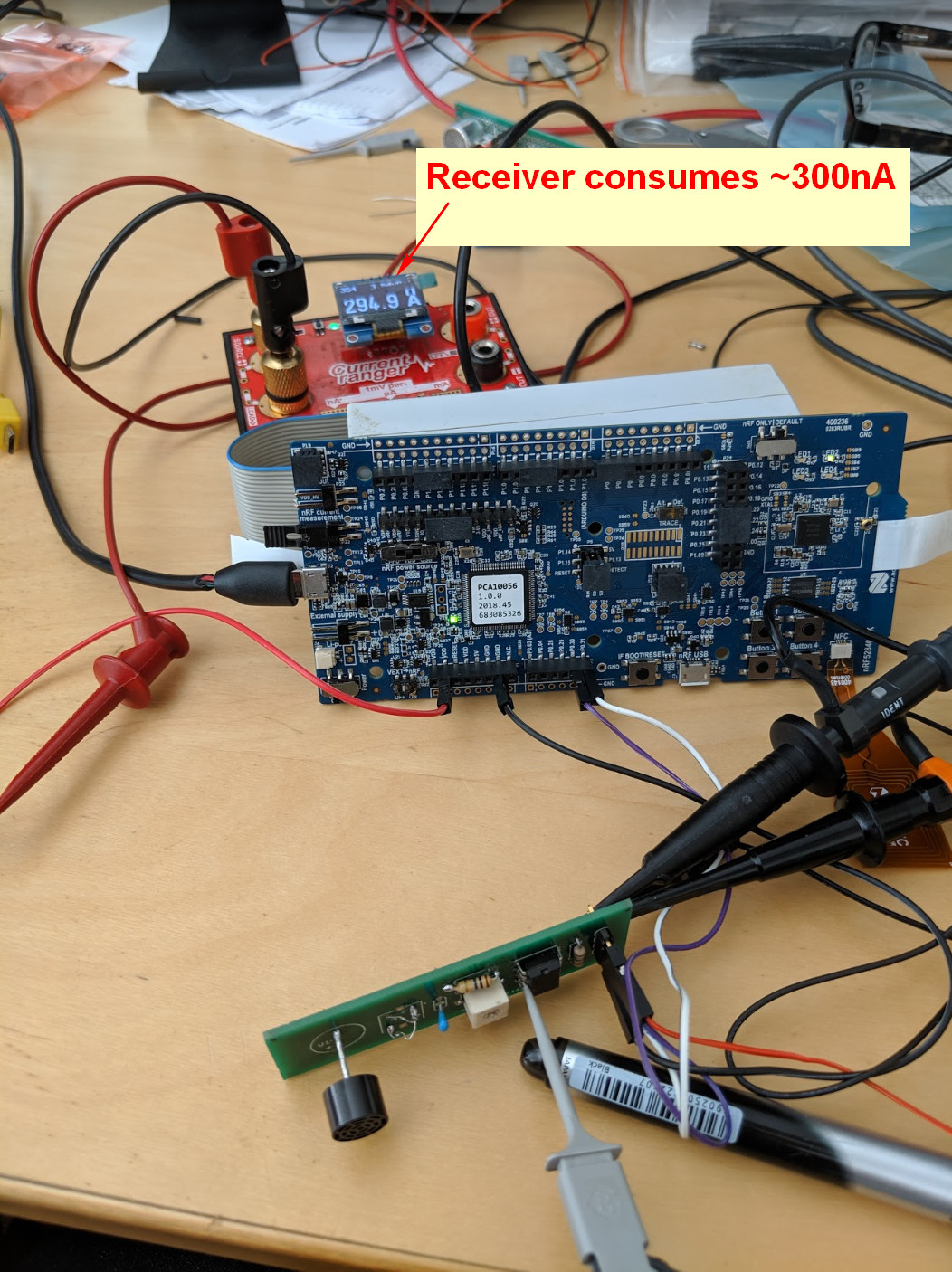 The nRF52 receiver is normally in deep sleep consuming 400nA. When a u/s pulse is detected my receiver raises a GPIO and the nRF52 resets(reboots). All it does is flash an LED and go back to sleep..
