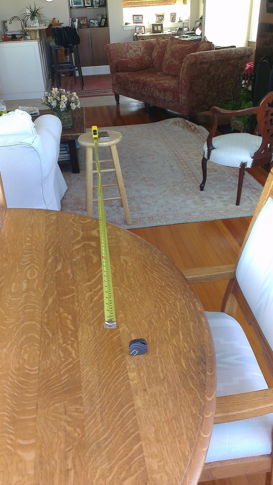 I put a tag on the arm of a wooden dining chain near the bay window. I measured off meters across the room until I ran out of space. (8 meters).